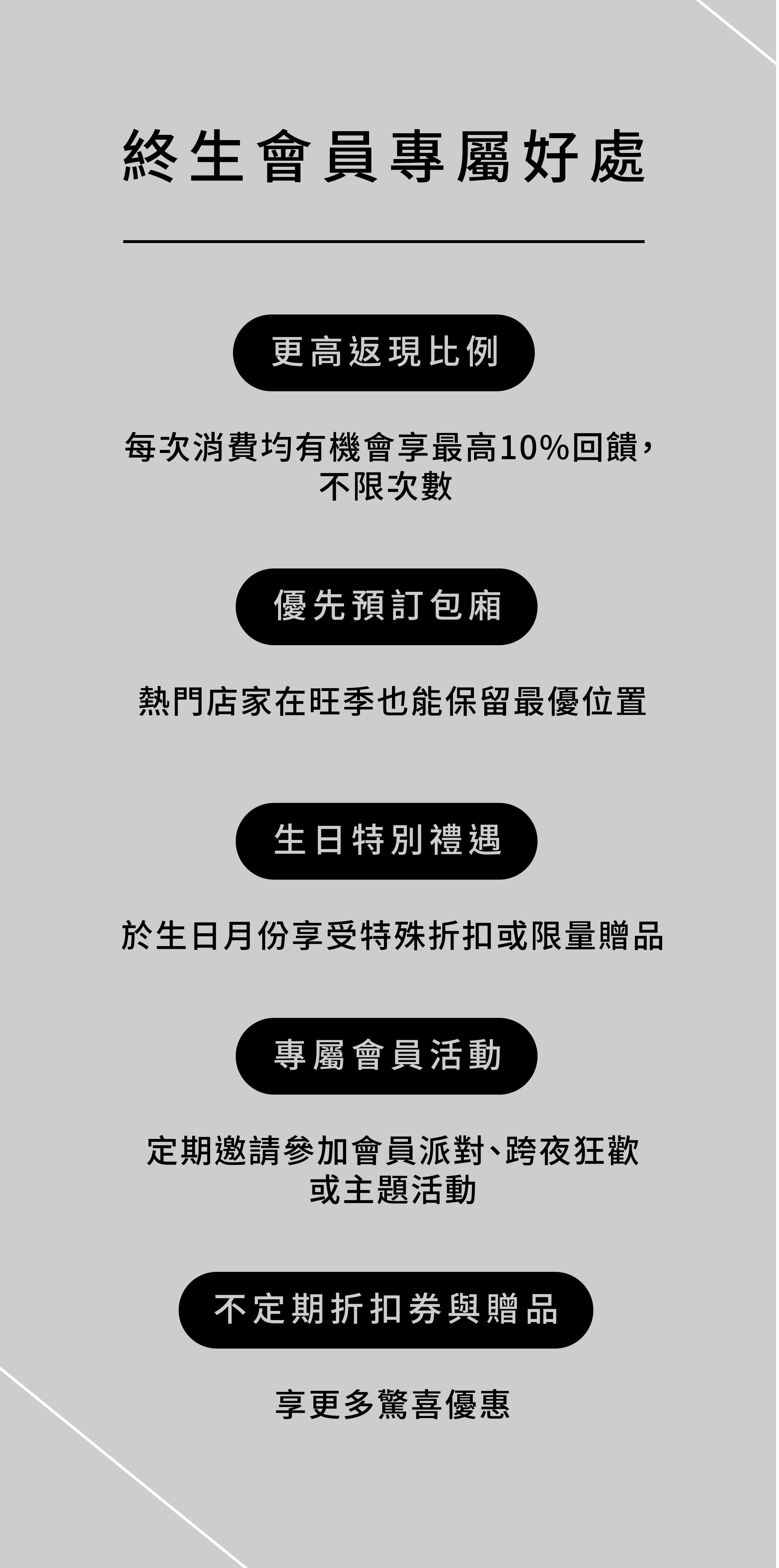 完成訂位返現後,您將自動升等為 VIP 終身會員,享有多項專屬禮遇與尊榮服務。更多會員福利詳情,敬請洽詢您的專屬管家團隊。